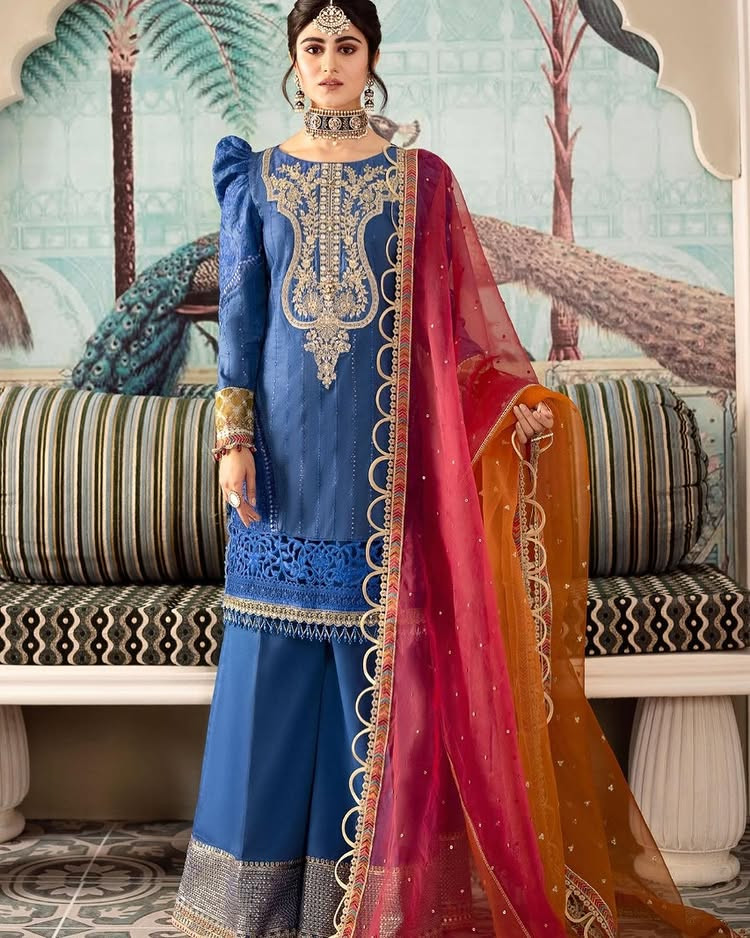 Blue Color Party Wear Unstitched Rayon Cotton Lawn